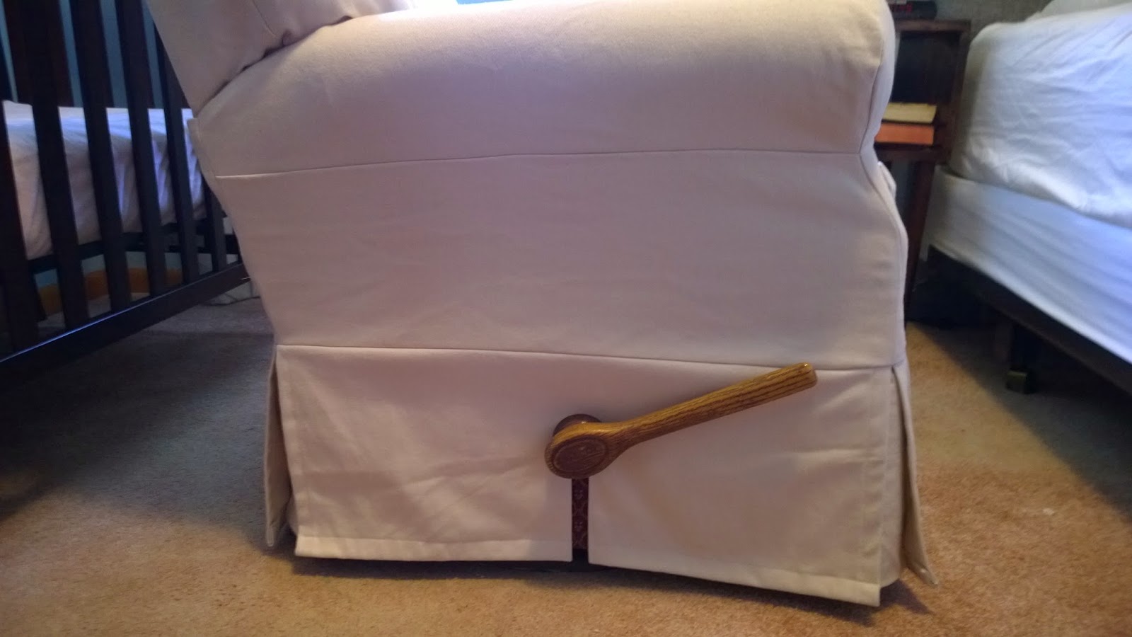 There were all sorts of options for putting the slit in the skirt for the recliner arm, but I ended up just doing this.